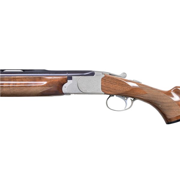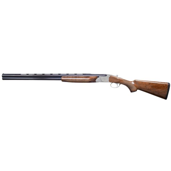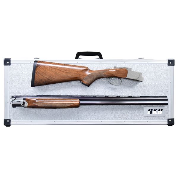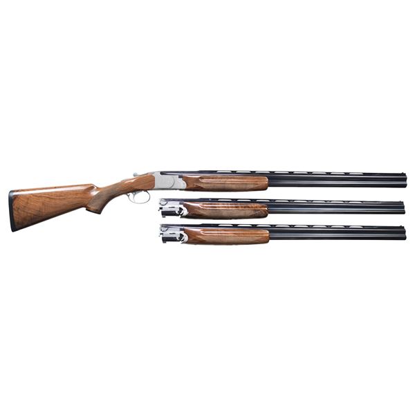 Cal. 410. 3", 28 ga. 2 3/4", 20 ga. 3". S# NS97578. All bbls are 28" vent rib white target front sights & steel mid beads. All bbls. have individual forearms. The 410 bbls have fixed Skeet chokes. The 28 ga. & 20 ga. bbls have interchangeable chokes w/ Skeet tubes included. Satin silver finished boxlock action has nearly full coverage foliate scroll ornamentation. SST. Ejectors. Capped pistol grip stock and all 3 forearms of nicely grained walnut have gloss finish & cut checkering. LOP. 14 1/8". Weight w/ 20 ga. bbls is 7 lbs. UNATTACHED ACCESORIES: SKB marked foam lined hard case. CONDITION: near excellent having over 98% original finish. Wood shows a few small scratches & marks. All bores are very good & bright. (25-917/DS). MODERN. $3,000-4,000.