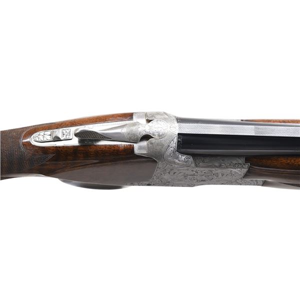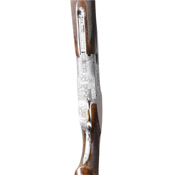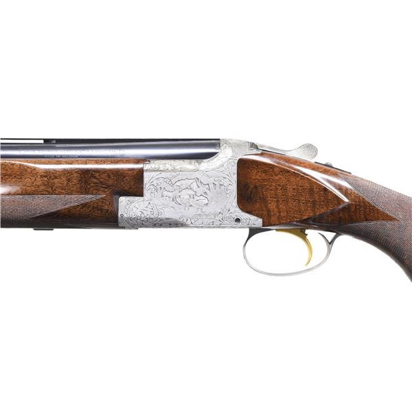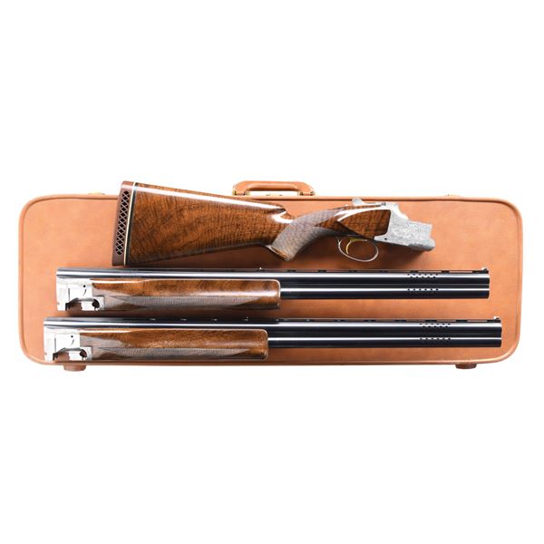 FIELD GUN WITH EXTRA SKEET BARRELS & CASE. Cal. 12 Ga. 2-3/4". S# 2772S72 (1972). The 26-3/8" skeet & skeet marked barrels as well as 28" modified and full marked barrels are both ported and have narrow ventilated ribs set with two white beads. All correct Browning markings are on top barrels with Morgan Utah and Montreal PQ addresses. Both barrel sets have been threaded for choke tubes. Coin finished superposed action fitted with gold plated single selective trigger is engraved in usual Diana style. Five pheasant in open woods are rendered in semi-relief on left side and four ducks in marsh are on right. Two quail are on bottom of action and two hares are on trigger guard bow. These scenes are off set by attractive well cut large open acanthus scroll. Engraver's signature "C. Baerten" (Claude) is on the bottom of each bird scene on sides. Quail and hares are not signed. Long tang square knob buttstock made of an exceptionally fine piece of vividly fiddle figured American walnut measures 14-1/2"over brown Browning pad. Point pattern checkering wraps over grip. Target type flared forends match well as to color but not figure. MEASUREMENTS: STOCK: DAH: 1-7/8". DAC: 1-3/8"+. CAST: neutral. LOP: 14-1/2". WEIGHT: 8 lb. 1 oz. UNATTACHED ACCESSORIES: gun and extra barrels are housed in Browning tan vinyl Hartmann case which contains cleaning cloth. CONDITION: metal and wood finishes are exceptionally fine with only a few handling and assembly marks. Bores are bright and shiny. Mechanically fine. Original chokes removed and barrels threaded for choke tubes only two of which are present in 28" barrels. Case is very fine with some light soiling. (24-2228/MGM). CURIO. $7,000-9,000.