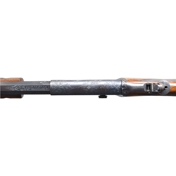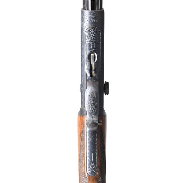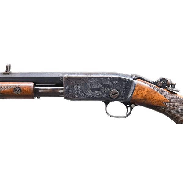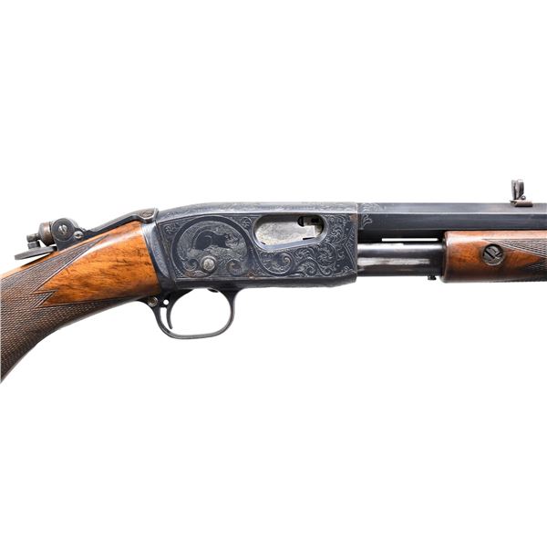 ACTION RIFLE. Cal. 22 S,L,LR. S# 63118. Bbl. 24" tapered octagon. Marble Sheard front sight, folding leaf rear sight w/ very rare King push button tang sight. Tubular mag. Action has full coverage F grade factory engraving. Right side has highly detailed scene of a squirrel on a branch. Left side has a detailed woodland scene of two cottontail rabbits. Scenes are surrounded by arabesque scroll, straight line & ornate borders. Complimenting engraving extends to upper & lower receiver areas as well as breech end of bbl. Forearm & round knob pistol grip stock of exhibition Circassian walnut w/ hand checkering & crescent steel trapdoor buttplate. Mfg. 1911. CONDITION: over 75% original blue showing slide & edge wear w/ spots of freckling on bbl. & mag. tube. Buttplate has faded to mottled gray. Original wood finish shows light wear w/ scattered scratches & marks. Lightly pitted bore w/ worn rifling. PROVENANCE: The estate collection of Don "Duck" Combs. (24-2414/DS). CURIO. $7,000-10,000.