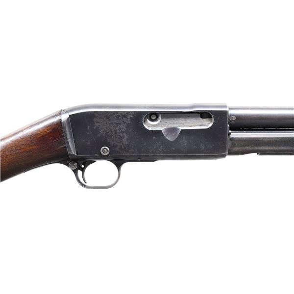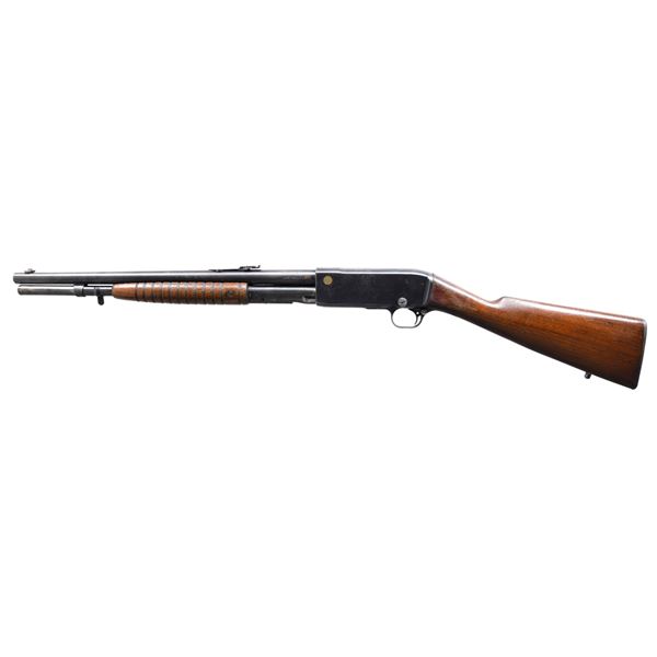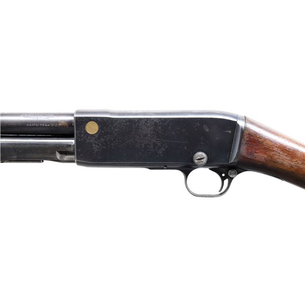 Cal. 44 Rem or 44 WCF. S# 44843. Bbl. 18 1/2" w/ bead front sight & wheel adj. V notch rear sight. Full length tubular mag. Grooved slide handle & straight grip walnut stock w/ checkered aluminum buttplate. Added swivel bases. CONDITION: 70% lightly faded original blue showing areas of corrosion & very light pitting. Stocks have added finish over wear w/ scratches, dents & marks. Stock has small chips at bottom of action & tang. Very good bore. PROVENANCE: The estate collection of Don "Duck" Combs. (24-2467/DS). CURIO. $1,200-1,800.