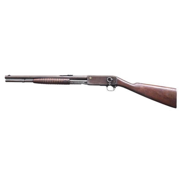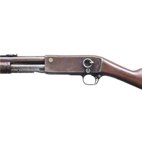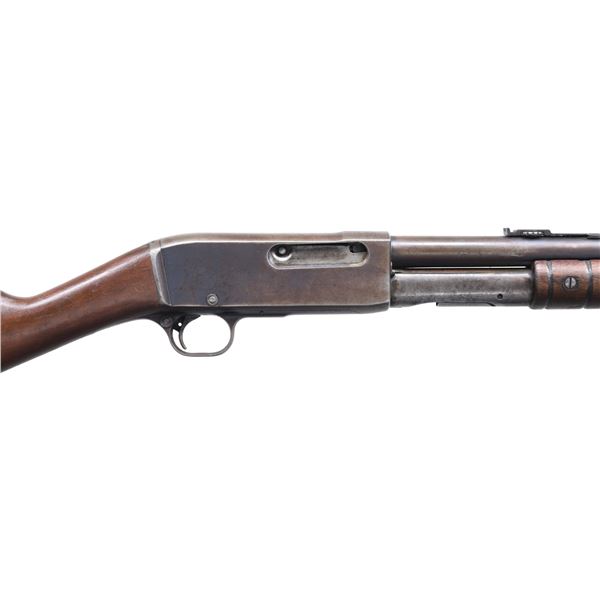 Cal. 38-40 Rem or 38 WCF. S# 71951. Bbl. 18 1/2". Bead front sight w/ wheel adj. V notch rear sight. Full length tubular mag. Action has saddle ring on left side. Grooved slide handle & straight grip walnut stock w/ checkered aluminum buttplate. CONDITION: blue has largely faded to brown showing scattered spots of very light pitting. Wood has added finish over heavy wear w/ numerous dents, scratches & marks. Bore has lightly worn rifling w/ scattered spots of very light pitting. PROVENANCE: The estate collection of Don "Duck" Combs. (24-2451/DS). CURIO. $800-1,200.