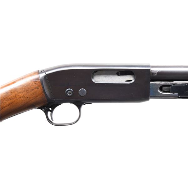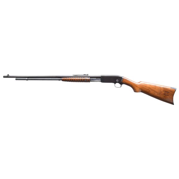 Cal. 25-20. S# 12244. Bbl. 24" round w/ sporting sights. Tubular mag. Grooved slide handle & pistol grip walnut stock having crescent steel buttplate. Left side of stock is stamped "PROPERTY / PEORIA / COUNTY / BANKERSFIELD". CONDITION: over 95% blue showing light slide & edge wear. Refinished stocks show wear marks & handling marks. Very good bright bore. PROVENANCE: The estate collection of Don "Duck" Combs. (24-2475/DS). CURIO. $1,000-1,500.