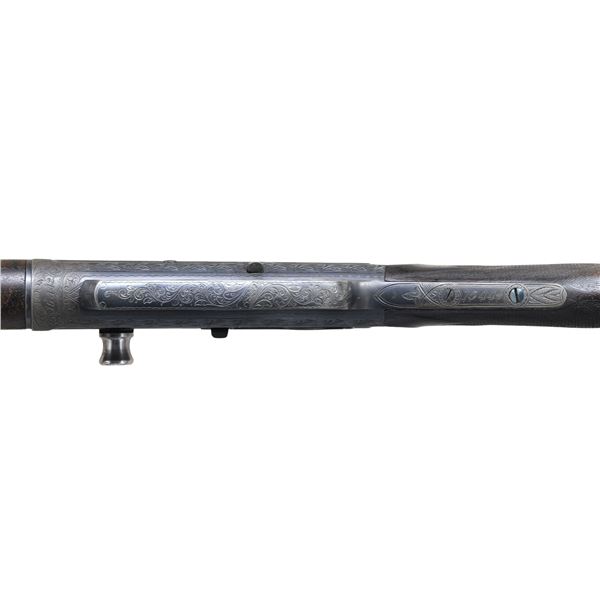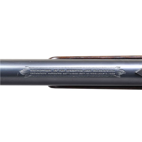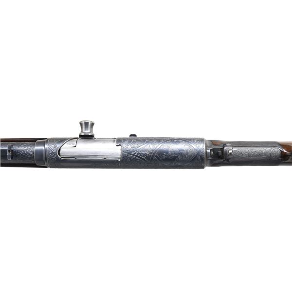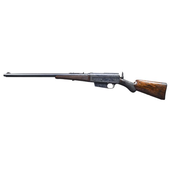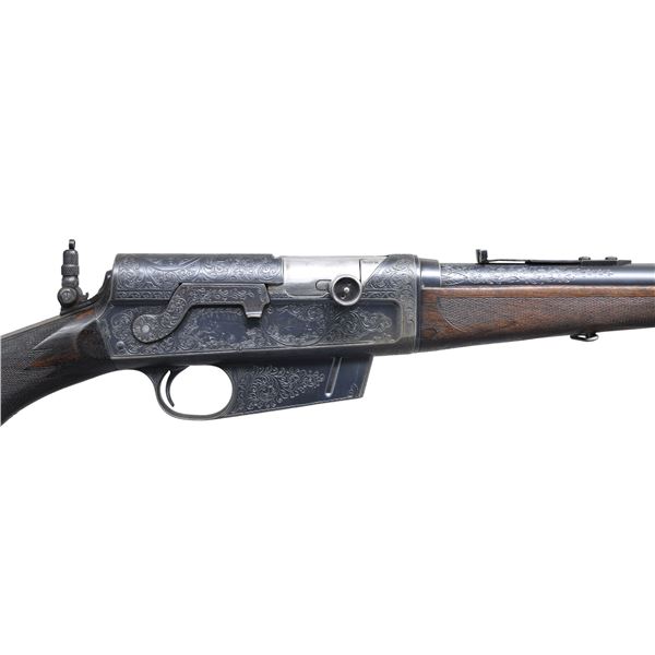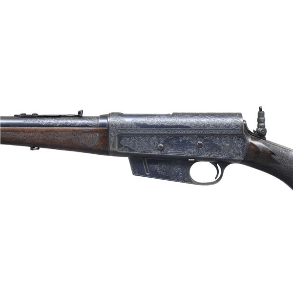 LOADING RIFLE. Cal. 35 Rem. S# 15442. Bbl. 22" in recoil spring sleeve. Ramp mounted King front sight, Western flat top sporting rear sight & Marble tang sight. Recoil operated action w/ fixed box mag. Full coverage style F factory engraving features vignettes of bear & deer on right side w/ two mule deer bucks on left side. Top of receiver shows a mule deer buck portrait. Scenes are surrounded by full coverage of vine type foliate scroll w/ punch dot backgrounds & elaborate borders. The engraving continues to the mag. box & breech end of bbl. Schnable tipped forearm & round knob pistol grip stock of fine thin shell walnut w/ elaborate hand checkering. Toeline of stock has brass nameplate w/ initial "H". LOP: 13 1/2" to curved Remington hard rubber buttplate. CONDITION: 90% lightly worn original blue. Wood shows finish & checkering wear w/ age darkening, having numerous dents, scratches & marks. Stock & buttplate are chipped at toe. Sound action. Very good bright bore. (25-569/DS). CURIO. $6,500-9,500.