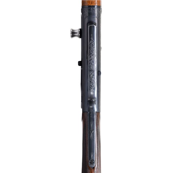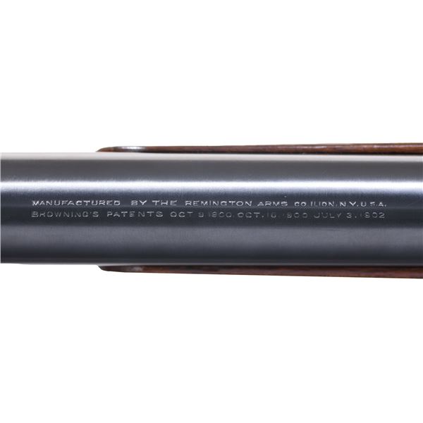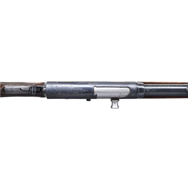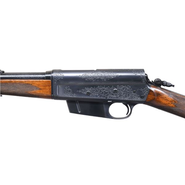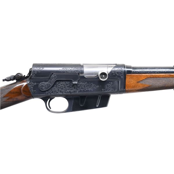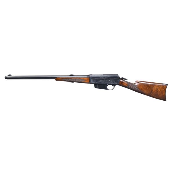 LOADING RIFLE. Please note as of 4/24/25 this item description has been updated. Please revisit this description and contact us with any questions. Cal. 30 Rem. S# 25922. Bbl. 22". Ramp mounted W. F. Sheard gold bead front sight, two folding leaf rear sight & Marbles combination tang sight. Recoil operated rifle w/ action spring housed in bbl. sleeve. Action & breech end of bbl. sleeve have factory "D" grade engraving, which consists of vine type foliate scroll w/ wavy borders. Forearm & straight grip stock of fancy thin shell walnut features cut checkering & crescent steel buttplate. Mfg. 1906-1936. CONDITION: nicely restored rifle with 98% refinished metal. Stocks have very good refinish & checkering shows a few very light handling marks. Bore is bright w/ strong rifling. (25-567/DS). CURIO. $4,000-6,000.