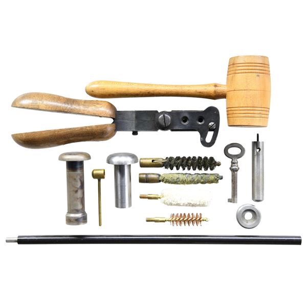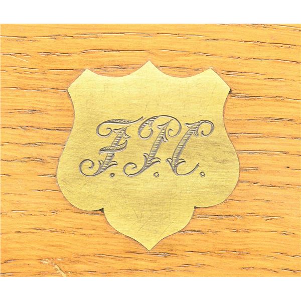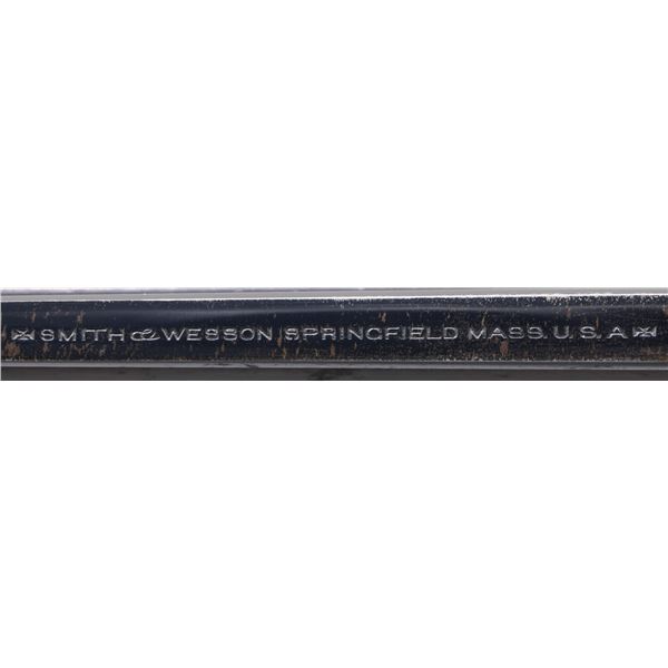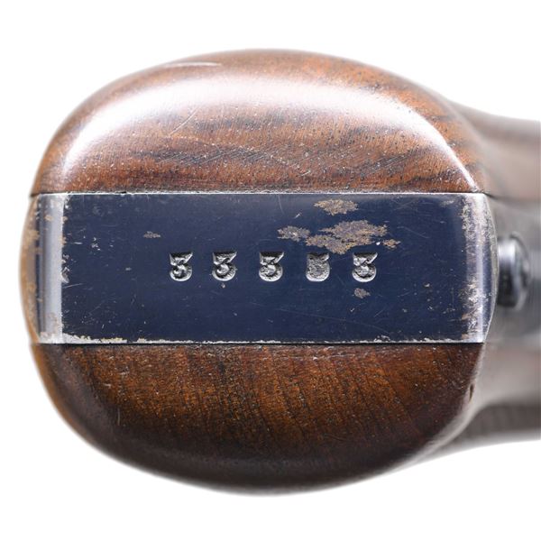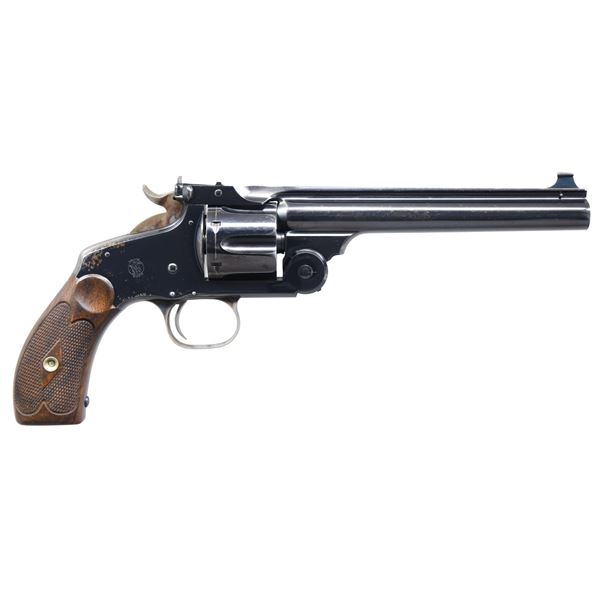 Cal. 44 Russian. S# 33353. Bbl. 6 1/2" w/ rib. Pinned blade bead front sight & U notch adj. rear sight. Six shot 1-9/16" fluted cyl. Blue finished top break action w/ case colored hammer & trigger guard. Two piece checkered walnut round butt grips. Introduced in 1878 & shipped until 1912, all frames were mfg. by 1898. UNATTACHED ACCESSORIES: hardwood presentation case w/ green felt fitted interior. Case contains 2 cavity bullet mold, wood mallet, assorted cleaning tools, loading tools & case key. Inside of lid has gold colored marking "A.GUINARD/AVENUE DE L'OPERA / PARIS". Brass shield on lid exterior is marked w/ stylized initials that appear to be "FPC". CONDITION: over 80% bright blue showing scattered spotting & handling marks. Very good grips. Sound & tight action. Bright near excellent bore. (01-26166/DS). ANTIQUE. $5,000-8,000.
