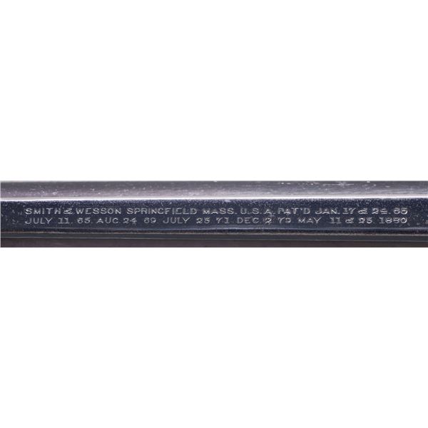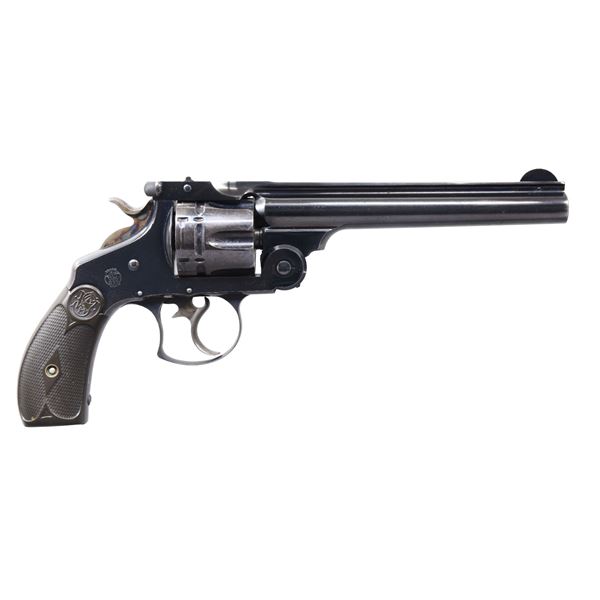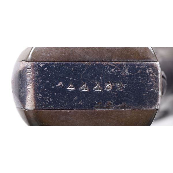 Cal. 44 S&W Russian. S# 44462. Bbl. 6 1/2" with pinned half moon blade sight plus notch in barrel latch at rear. Barrel rib has patent markings with last date of 1880. Mfg. 1881-1913 yet all frames made prior to 1899 being categorized as antiques. Total production of 53,590 units numbered 1-54668. Blued finish with vivid case colors on trigger and hammer. Often referred to as New Model Navy No. 3. Matching numbers on frame, barrel, barrel latch, cylinder and its checkered hard rubber grips. Fluted cylinder of double lock type is from later production measuring 1 9/16" in length. CONDITION: good plus overall appearance with factory quality refinish being glossy and bright but having pepper oxidation throughout. Especially nice case colors and near excellent, bright shiny bore. Light hand wear to grips. Three small notch like marks on left edge of butt that do not interfere with the grips. Solid barrel lock up with very minimal perceived movement. Proper cylinder timing on 5 of 6 chambers; very slightly "off" on one. PROVENANCE: From the Lifelong Collection of George Staden S&W Member #3451. (01-26248/NW). ANTIQUE. $2,500-3,500.