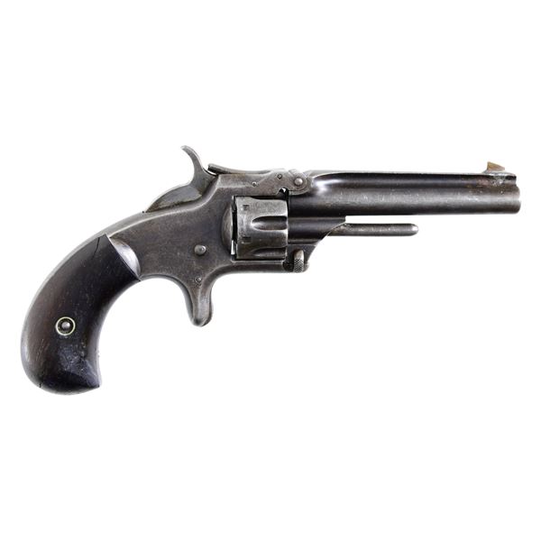 Cal. 22 RF. S# 6268. Bbl. 3 3/16". Replacement brass blade front sight. 3rd issue S&W No. 1 revolver. Smooth hardwood grips. CONDITION: right grip panel shows a long crack along its length, grips otherwise show a few other cracks, flaking dark finish, dings & handling marks. Metal has a gray appearance with a brazed repair on rib below front sight, scattered light dings & oxidation. Hammer does not rotate cyl. when hand cycled & cyl. appears loose. Pitted bore with visible rifling. (01-26571/MJC). ANTIQUE. $200-400.