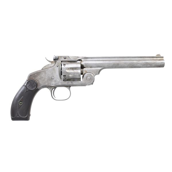 Please note as of 5/6/25 this item description has been updated. Please revisit this description and contact us with any questions. Cal. 32-44 S&W (32 S&W Long). S# 65. Bbl. 6 1/2". Blade front sight. V-notch rear sight. Matching numbers on frame & cyl. Bbl. number is illegible due to old oxidation. Grips are scratch numbered matching to gun. Early S&W New Model 3 with very low serial number & moderate knuckle on backstrap. Metal has a silvery-gray appearance. Checkered brown hard rubber grips with S&W monograms. Altered hammer spur. CONDITION: top of left grip panel has repaired crack across it, grips otherwise show some checkering wear, scratches & handling marks. Metal is a silvery-gray color with scattered oxidation & light pitting. Cyl. rotates slightly when trigger is pulled but action is otherwise functional when hand cycled. Bore shows scattered notable pitting patches but visible rifling. (01-26853/MJC). ANTIQUE. $1000-1500.