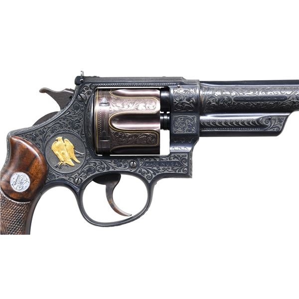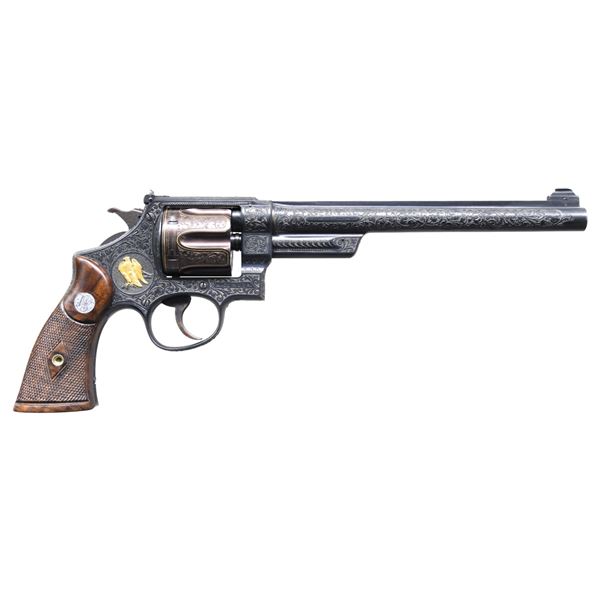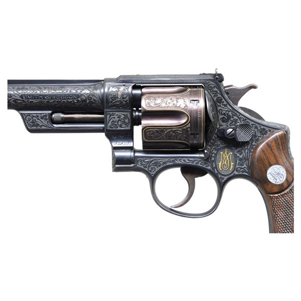 ARNOLD GRIEBEL. Cal. 357 Mag. S# 53164. Bbl. 8 3/4" with factory installed Marble No. 35F gold bead front sight; frame contoured and engraved adjustable rear sight with "U" notch blade rather than normal square notch. Shipped August 3, 1937 to Beatrice, NB Police Dept. with June 10, 1937 order stating sighted at 50 yards with 357 ammo using 6 o'clock hold. References state only 735 Registered Magnums made with this longest barrel offering. Magna grips with diamond center having unmarked machined locating disks, large silver medallions and engraved head of grip screw. Engraver Griebel was born 1890 in Germany and studied in Suhl; he immigrated to the US in 1928 where he worked as a die engraver while engraving firearms part time. He worked in the Chicago area and was mostly active in the 1940's to the early 1960's; he died in 1970 at the age of 79. He was a master engraver who was considered the best of his era by E. C. Prudhomme and often featured by John Amber in his publications. This revolver has his classic floral scrollwork with shaded backgrounds along with gold embellishments. The perimeter of the cylinder is outlined in gold plus there is a gold "JM" (or IM) monogram on the left side below the cylinder latch. The side plate has a vignette of a perched eagle in raised gold relief with shaded background. The butt is signed "ENGR. BY A. GRIEBEL". Coverage is very close to full with a unique feature by the top of the grips; the design has what appears to be a border that follows the arc of the grips yet if the Magna grips are removed, there is continued blended coverage that would show properly if service grips were installed. Registration number is 2621. Matching serial numbers on frame, barrel, cylinder and extractor. Grip straps have the early 6 groove pattern. Case colored serrated trigger of standard width plus finely checkered standard width hammer with fine concentric grooves on sides. UNATTACHED ACCESSORIES: factory letter of 2021 and copy of original invoice confirming prior information. CONDITION: extremely faint cylinder turn line. Case colors are somewhat faded. Very small spot of thinning finish on each side of the barrel at muzzle. Cylinder has a plum hue resulting from its refinish after engraving as the cylinder steel is factory hardened because of the 357 Magnum intensity. Very light handling marks on the bottom of the grips plus a small spot of diamond top wear at lower rear of left grip. Near excellent bore and timing. PROVENANCE: From the Estate of Jon Thomas, Gunsport, LTD.; formerly of the Dr. Gerald Klaz collection. (25-1118/NW). CURIO. $12,000-16,000.