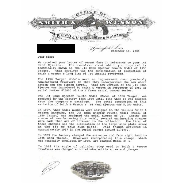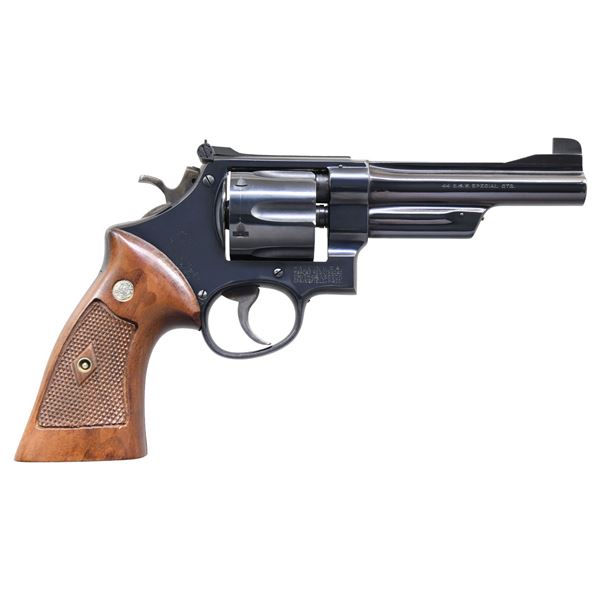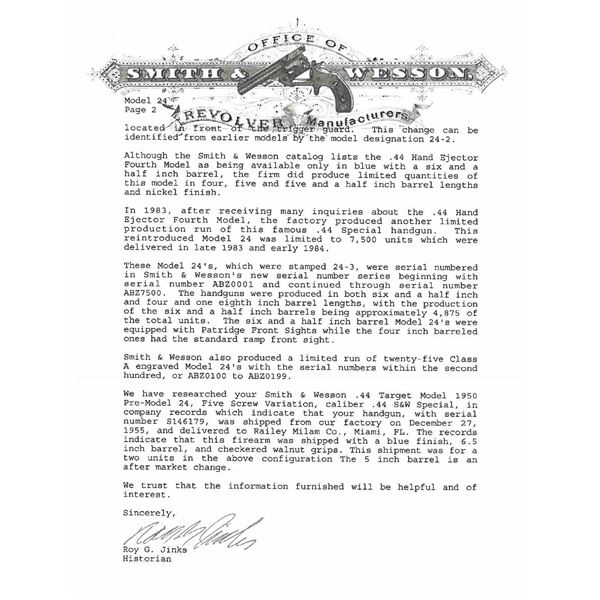 Cal. 44 Spcl. S# S146179. Bbl. 5" pinned. Patridge front sight. Adjustable square notch rear sight. Matching numbers on grip frame, bbl., cyl. & extractor. 4th Model Target 44 Hand Ejector Target revolver. Five screw revolver made 1955. Blued finish with case colored hammer & trigger. Unnumbered checkered walnut target grips with silver S&W medallions & diamond center. UNATTACHED ACCESSORIES: factory letter that states this revolver was shipped to Railey Milam Company in Miami, FL in December 1955. Further the letter states the revolver shipped with a 6 1/2" bbl. meaning the bbl. is altered & there were two guns in the shipment. CONDITION: grips show a couple light small chips & some handling marks. Hammer & trigger retain strong amounts of case colors with some fading to gray, operational wear & light oxidation. Balance of metal retains 98% factory quality reblue with some light edge & operational wear. Action functions properly when hand cycled. Bright near excellent bore. PROVENANCE: From the Estate of Jon Thomas, Gunsport, LTD. (25-1085/MJC). CURIO. $1500-2500.