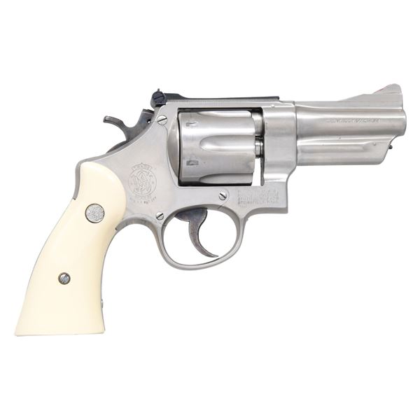Cal. 357 Mag. S# S150806. Bbl. 3 1/2" pinned. Ramped serrated blade front sight with added orange paint. Adjustable square notch rear sight. Matching numbers on frame, bbl., cyl. & extractor. Five-screw Pre-27 revolver made in the 1950's. Dull nickel finish with case colored trigger & hammer. Faux ivory grips with silver S&W medallions. Grip not moving & unable to remove grips. UNATTACHED ACCESSORIES: unnumbered but correct gold factory box. CONDITION: grips show light handling wear. Trigger & hammer retain most of their case colors with some operational wear. Balance of metal has a dull cleaned appearance with some light oxidation spots & handling wear. Action functions properly when hand cycled. Bright near excellent bore. PROVENANCE: From the Lifelong Collection of George Staden S&W Member #3451. (25-108/MJC). CURIO. $1000-1500.