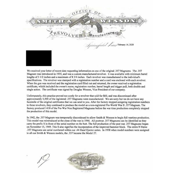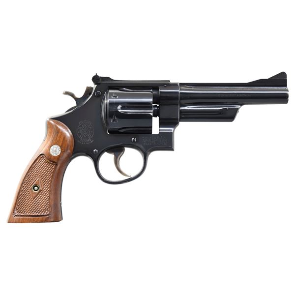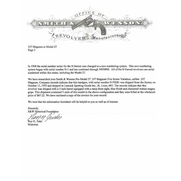 Cal. 357 Mag. S# S159281. Bbl. 5" pinned. Ramped serrated blade front sight. Adjustable square notch rear sight. Matching numbers on grip frame, bbl., extractor, cyl. & right grip panel. Five-screw Pre-27 made 1955. Blued finish with case colored hammer & trigger. Checkered diamond center grips with silver S&W medallions. UNATTACHED ACCESSORIES: matching numbered factory gold box with factory letter that confirms the guns configuration. The letter further states the gun was part of a 5 gun shipment to Leacock Sporting Goods in 1955 & includes a copy of the invoice for that shipment. CONDITION: grips show some light handling marks & wear. Hammer & trigger retain most of their case colors with light operational wear. Balance of metal retains 98% original blue with some edge wear, a couple silvering spots & a drag line on cyl. Cyl. is sluggish when it swings out but action otherwise functions properly when hand cycled. Bright near excellent bore. PROVENANCE: From the Estate of Jon Thomas, Gunsport, LTD. (25-1115/MJC). CURIO. $2000-3000.
