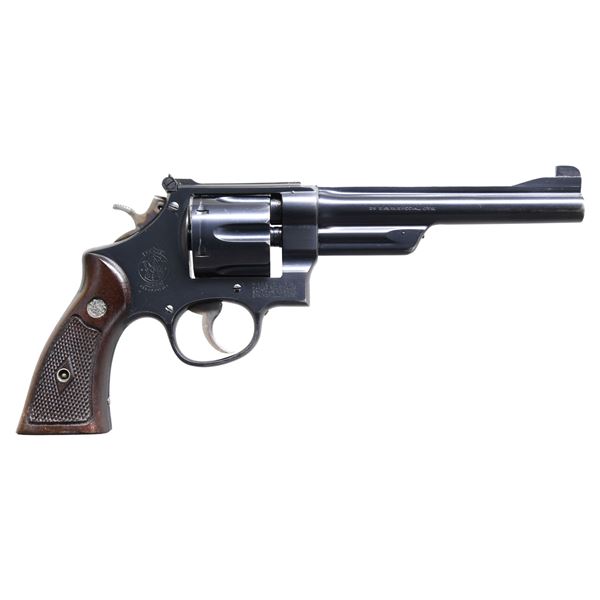 REVOLVER. Cal. 38 Spl. S# S78868. Bbl. 6 1/2" pinned. Patridge front sight. Adjustable square notch rear sight. Matching numbers on grip frame, cyl., bbl., extractor & right grip panel. 1950-1951 made S&W 38/44 Outdoorsman revolver. Blued finish with case colored hammer & trigger. Checkered walnut grips with diamond center & silver S&W medallions. UNATTACHED ACCESSORIES: correct unnumbered gold two-piece factory box. CONDITION: grips show scattered light handling marks & wear. Trigger & hammer retain most of their case colors with some operational wear & oxidation stain specks. Balance of metal retains 95% original blue with scattered edge wear, some light oxidation specks & a drag line on cyl. Action functions properly when hand cycled. Bright near excellent bore. PROVENANCE: From the Lifelong Collection of George Staden S&W Member #3451. (25-82/MJC). CURIO. $1200-1800.
