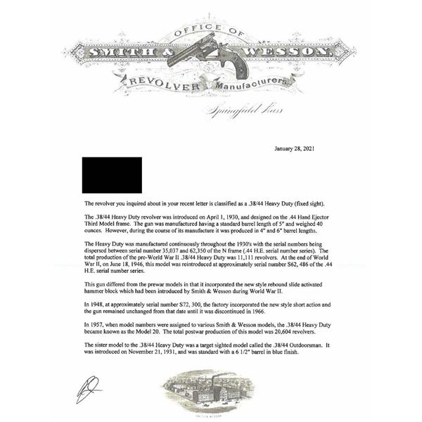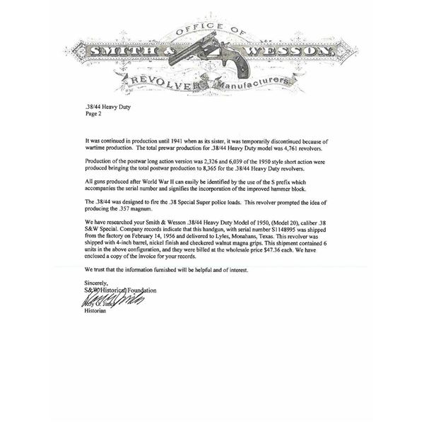 Cal. 38 Spl. S# S148995. Bbl. 6 1/2" pinned. Round blade front sight. Fixed rear sight. Matching numbers on grip frame, cyl., extractor & bbl. Bbl. number is on rear face of ejector housing & has a star denoting factory rebarrel. 1955-1956 made five-screw 38/44 Outdoorsman Model of 1950 Revolver. Nickel finish with case colored trigger & hammer. Checkered walnut grips with silver S&W medallions & diamond center. Number on right panel of grip is faint & does not appear to match frame. UNATTACHED ACCESSORIES: unnumbered gold factory box for a 6 1/2" nickel 38/44 Heavy Duty & factory letter that states the gun shipped with a 4" bbl but was nickel finished. Letter further states that the gun was part of a 6-gun shipment to Lyles, Monhans in El, Paso in 1956. CONDITION: grips show some worn checkering, light dings & handling marks. Trigger & hammer retain most of their case colors with some operational wear & light oxidation. Balance of metal retains most of its factory reworked nickel with some oxidation mostly on grip frame, handling marks & operational wear. Action functions properly when hand cycled. Bright near excellent bore. PROVENANCE: From the Estate of Jon Thomas, Gunsport, LTD. (25-1097/MJC). CURIO. $1200-1800.