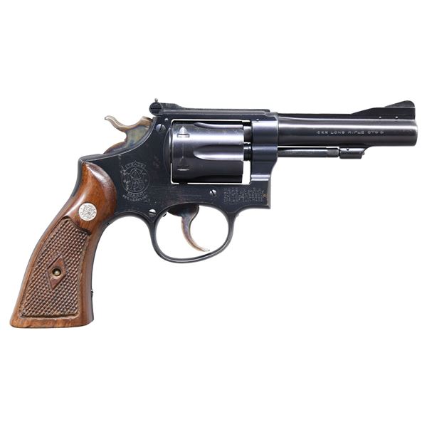 Cal. 22 LR. S# K201727. Bbl. 4" pinned. Ramped serrated blade front sight. Adjustable square notch rear sight. Matching numbers on frame, bbl., cyl., extractor & right grip panel. 1953 made five-screw K22 Masterpiece revolver. Blued finish with case colored hammer & trigger. Checkered walnut grips with diamond center & silver S&W medallions. UNATTACHED ACCESSORIES: unnumbered 22 Combat Masterpiece box with manual. CONDITION: grips show a tiny chip at front of right panel, some worn finish & handling marks. Trigger & hammer retain most of their case colors with some oxidation specks & operational wear. Balance of metal retains 85-90% original blue with scattered light oxidation, edge wear, fading & edge wear. Action functions properly when hand cycled. Bright near excellent bore. PROVENANCE: From the Lifelong Collection of George Staden S&W Member #3451. (25-75/MJC). CURIO. $700-1100.