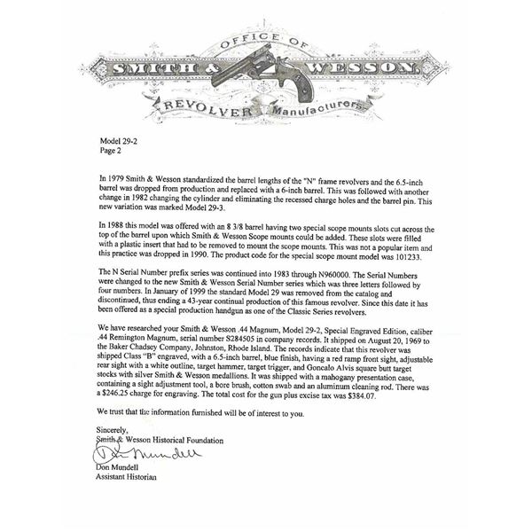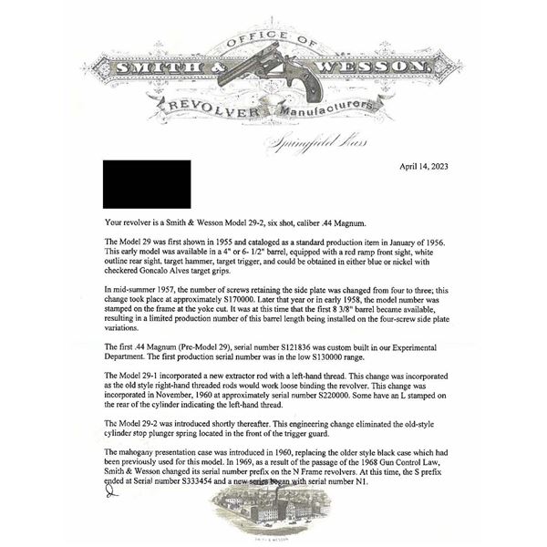 Cal. 44 Mag. S# S284505. Bbl. 6 1/2" with Baughman front sight having red insert plus frame mounted Micrometer rear having white outline. Mfg. 1969 (1958-1999); last year before "N" prefix was used due to provisions of the 1968 Gun Control Act. Shipped August 20, 1969 to Baker Chadsey Co. of Johnston, RI (bankrupt in 1983) with blued finish and class B engraving plus its standard mahogany presentation case with tools. Standard checkered target hammer and grooved target trigger; both case colored. Grips are Goncalo Alves Target grips with thumb recess and without diamond center around grip screw. Original revolver cost (plus excise tax) was $384.07 including $246.25 for the engraving; converted to today's dollar the amounts are $3,334 and $2,136 (revolver only listed as $165 in 1969 Gun Digest). Stamped Model 29 designation began 1957. In 1962 the -1 indicated a change in the ejector rod to left hand thread; avoiding loosening upon firing. In 1962 the cylinder stop screw in front of the trigger guard was eliminated; 4 screw to 3 screw designation. In 1968 the diamond around the grip screw was eliminated. In 1979 the 6-1/2" barrel was dropped and replaced with a 6" barrel. With the 29-3 the pinned barrel and recessed cylinder feature (coveted by S&W enthusiasts) was eliminated. The last "dash" model was 29-7 in 1998. Special editions after 1999 (from the S&W Performance Center or in the Classic Series) have continued to 29-10. This is the variation made famous by Clint Eastwood in the Dirty Harry movie of 1971. Clearly one of S&W's most iconic revolvers. UNATTACHED ACCESSORIES: 2023 factory letter supporting the information listed along with additional Model 29 history. CONDITION: very slight cylinder turn line. Near excellent finish, grips, bore and mechanical functioning. (25-1150/NW). CURIO. $2,500-3,500.