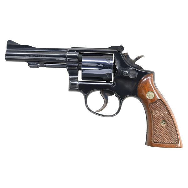 Cal. 38 Spl. S# 1K61368. Bbl. 4" pinned. Ramped serrated blade front sight. Adjustable square notch rear sight. 1971 made S&W 15-3 revolver. Blued finish with case colored hammer & trigger. Checkered walnut grips with matching numbered right panel & silver S&W medallions. UNATTACHED ACCESSORIES: factory box for a nickel 15-3 that is numbered to a different gun with cleaning kit, screwdriver, manual & paperwork. CONDITION: grips show some staining, light flaking finish & handling marks. Hammer & trigger retain much of their case colors with some light oxidation & fading. Balance of metal retains 97% original blue with a drag line on cyl. & some scattered edge wear. Action functions properly when hand cycled. Bright near excellent bore. (25-1603/MJC). CURIO. $600-1000.