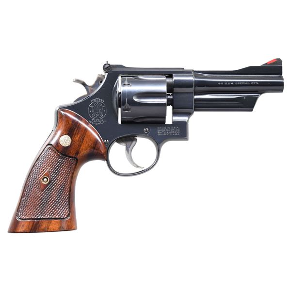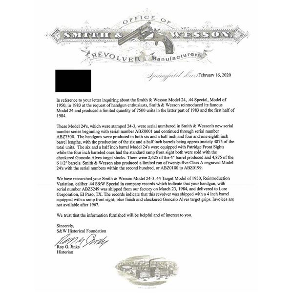 Cal. 44 Spl. S# ABZ5249. Bbl. 4". Ramped serrated blade front sight with orange insert. Adjustable square notch rear sight with white outline. 1984 made 24-3 revolver. Blued finish with case colored trigger & hammer. Checkered Goncalo Alves target grips with silver S&W medallions. UNATTACHED ACCESSORIES: factory letter that confirms the guns configuration & states it was shipped to the Lore Corporation in El Paso in 1984. CONDITION: refinished grips have added finish with some flaking & handling marks. Trigger & hammer retain most of their case colors with some fading to gray & operational wear. Balance of metal retains 97% original blue with some silvering on backstrap, a couple spots of light oxidation under grips & a drag line on cyl. Action functions properly when hand cycled. Bright near excellent bore. PROVENANCE: From the Estate of Jon Thomas, Gunsport, LTD. (25-1086/MJC). MODERN. $800-1200.