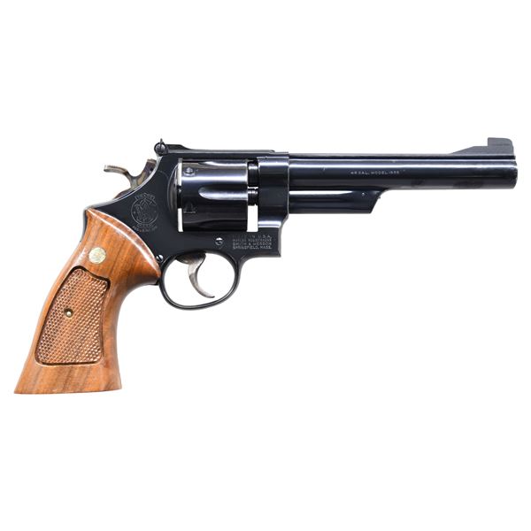 Cal. 45 ACP. S# N139711. Bbl. 6 1/2" pinned. Patridge front sight. Adjustable square notch rear sight. 1973 made 25-2 revolver. Left side of bbl. marked "45 CAL. MODEL 1955". Blued finish with case colored target trigger & hammer. Checkered walnut target grips with silver S&W medallions. UNATTACHED ACCESSORIES: matching numbered factory box that shows a tear on label side, warranty paperwork, cleaning kit & screwdriver. CONDITION: grips show light handling wear & marks. Trigger & hammer retain of their case colors with some operational wear. Balance of metal retains 98% original blue with some light edge & operational wear. Action functions properly when hand cycled. Bright near excellent bore. PROVENANCE: From the Lifelong Collection of George Staden S&W Member #3451. (25-106/MJC). CURIO. $700-1100.