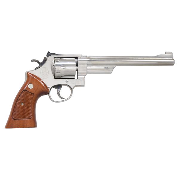 Cal. 357 Mag. S# N496879. Bbl. 8 3/8" pinned. Patridge front sight. Adjustable square notch rear sight. 1978 made 27-2 revolver. Nickel finish with case colored target trigger & hammer. Checkered walnut target grips with silver S&W medallions. UNATTACHED ACCESSORIES: hardwood display case with paperwork, cleaning kit & screwdriver. CONDITION: consignor states revolver has not been fired since leaving factory. Metal & grips show minor wear from handling & cycling. Action functions properly when hand cycled. Bright near excellent bore. PROVENANCE: From the Lifelong Collection of George Staden S&W Member #3451. (25-116/MJC). MODERN. $800-1200.