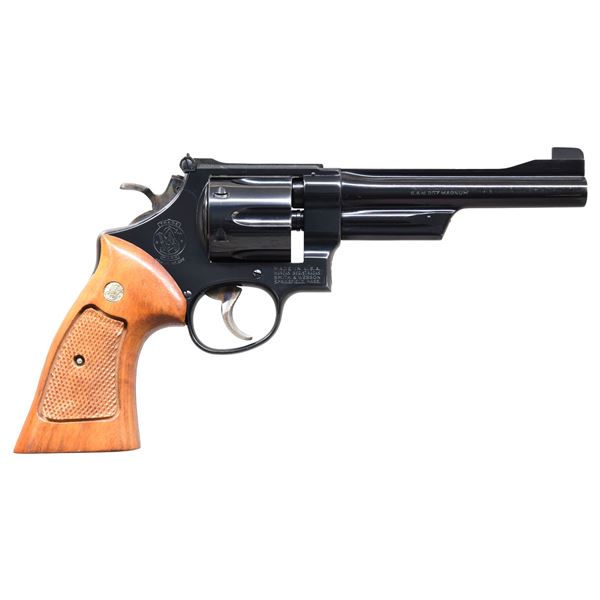 Cal. 357 Mag. S# N673137. Bbl. 6" pinned. Patridge front sight. Adjustable square notch rear sight. Model 27-2 revolver made 1979-1980. Blued finish with case colored target hammer & trigger. Checkered walnut target grips with silver S&W medallions. UNATTACHED ACCESSORIES: hardwood display case with cleaning kit & screwdriver. CONDITION: grips show a few scattered handling marks. Trigger & hammer retain most of their case colors with some fading to gray & operational wear. Balance of metal retains 95% original blue with scattered edge & operational wear. Action functions properly when hand cycled. Bright near excellent bore. PROVENANCE: From the Lifelong Collection of George Staden S&W Member #3451. (25-115/MJC). MODERN. $700-1000.