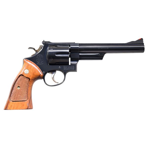 Cal. 44 Mag. S# N357965. Bbl. 6 1/2" pinned bbl. Ramped serrated blade front sight with orange insert. Adjustable square notch rear sight with white outline. Made 1975-1976. Blued finish with case colored target trigger & hammer. Checkered hardwood target grips with silver S&W medallions. UNATTACHED ACCESSORIES: hardwood display case with factory paperwork & 1977 dated gun store receipt. CONDITION: grips show some light chipping on bottom, scattered flaking & handling marks. Trigger & hammer retain nearly all their case colors with some operational wear. Balance of metal retains 98% original blue with some light edge wear & a minor ding on left side of bbl. rib. Action functions properly when hand cycled. Bright near excellent bore. PROVENANCE: From the Lifelong Collection of George Staden S&W Member #3451. (25-122/MJC). MODERN. $900-1400.