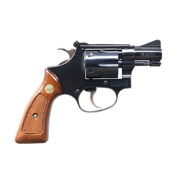 Cal. 22 LR. S# M101655. Bbl. 2" pinned. Ramped serrated blade front sight. Adjustable square notch rear sight. Mfg. 1978. Blued finish with case colored trigger & hammer. Checkered walnut grips with matching numbered right panel & silver S&W medallions. UNATTACHED ACCESSORIES: matching numbered factory box with manual, paperwork, screwdriver & cleaning kit. CONDITION: left grip panel shows a very small light ding at bottom, grips otherwise near excellent. Trigger & hammer retain nearly all their case colors with some minor operational wear. Balance of metal retains 99% original blue with some minor wear around left upper rear sideplate screw. Action functions properly when hand cycled. Bright near excellent bore that appears to have been seen little if any use. PROVENANCE: From the Lifelong Collection of George Staden S&W Member #3451. (25-129/MJC). MODERN. $700-1100.