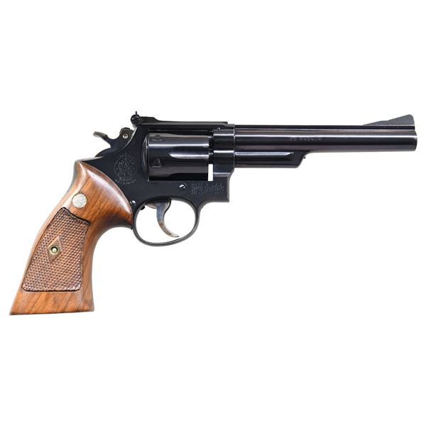 Cal. 22 Rem Jet. S# K443032 . Bbl. 6" pinned. Ramped serrated blade front sight. Adjustable square notch rear sight. 1961 made S&W Model 53. Blued finish with case colored trigger & hammer. Diamond walnut target grips with silver S&W medallions. UNATTACHED ACCESSORIES: walnut display case with 22 LR six inserts & screwdriver. CONDITION: grips show some light handling marks & wear. Trigger & hammer retain most of their case colors with some light operational wear. Balance of metal retains 98% original blue with a hint of edge wear on both sides of muzzle & some operational wear. Action functions properly when hand cycled. Bright near excellent bore. PROVENANCE: From the Lifelong Collection of George Staden S&W Member #3451. (25-157/MJC). CURIO. $1500-2200.