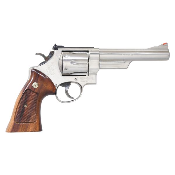 Cal. 41 Mag. S# N789611. Bbl. 6" pinned. Ramped serrated blade front sight with orange insert. Adjustable square notch rear sight with white outline. 1980 made Model 57 revolver. Nickel finish with case colored target trigger & hammer. Checkered hardwood target grips with silver S&W medallions. UNATTACHED ACCESSORIES: factory walnut presentation case with cleaning kit, manual, paperwork & screwdriver. CONDITION: grips show light handling wear. Trigger & hammer retain nearly all their case colors with some operational wear. Balance of metal retains nearly all of its original nickel with some operational & light handling wear. Action functions properly when hand cycled. Near excellent bright bore. PROVENANCE: From the Lifelong Collection of George Staden S&W Member #3451. (25-161/MJC). MODERN. $800-1200.