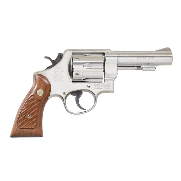 Cal. 41 Mag. S# N273572. Bbl. 4" pinned & heavy. Ramped serrated blade front sight. Fixed rear sight. Model 58 revolver made 1974-1977. Nickel finish with case colored trigger & hammer. Checkered walnut grips with mismatched number on right panel & silver S&W medallions. UNATTACHED ACCESSORIES: matching numbered factory box with manual & paperwork. CONDITION: grips show light handling war. Trigger & hammer retain nearly their case colors with some operational wear. Balance of metal near excellent with light handling & operational wear. Action functions properly when hand cycled. Bright near excellent bore. PROVENANCE: From the Lifelong Collection of George Staden S&W Member #3451. (25-163/MJC). MODERN. $900-1400.