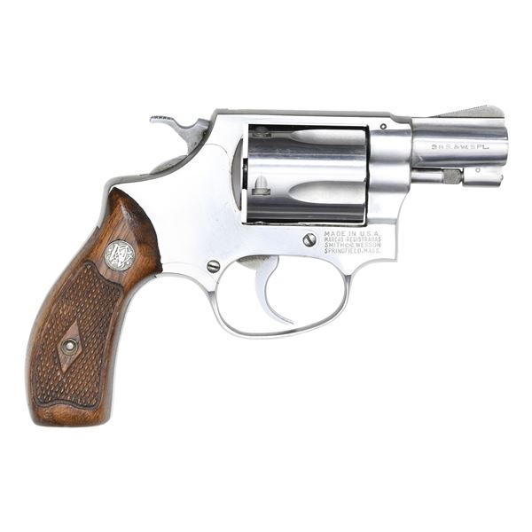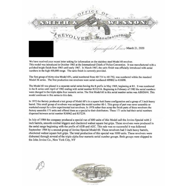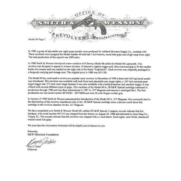 Cal. 38 Spl. S# 491153. Bbl. 2" pinned. Ramped serrated blade front sight. Fixed rear sight. Early no-dash Model 60 made in 1968. 5-shot cyl. Stainless finish with hard chrome hammer & trigger. Checkered diamond center walnut grips with matching numbered right panel & silver S&W medallions. UNATTACHED ACCESSORIES: matching numbered factory box with manual. Box has some torn labels around edges & a Stainless Steel stick on label. Also included is a factory letter that confirms the configuration & states it was shipped to Jesse Harp. Co. in Tampa in 1968. CONDITION: grips show a couple light chips near checkering & some handling marks. Metal shows some scattered light scratches & some operational wear. Action functions properly when hand cycled. Near excellent bore. PROVENANCE: From the Estate of Jon Thomas, Gunsport, LTD. (25-1090/MJC). CURIO. $800-1200.