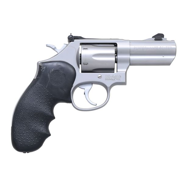 REVOLVER. Cal. 357 Mag. S# FCP1314. Bbl. 3" ported w/ rib & shrouded extractor. Red ramp front sight w/ square notch adj. rear sight. Six shot fluted cyl. 3 screw K frame. Smooth .265 trigger. .375 spur hammer. Contoured cyl. latch. Stainless steel construction w/ bead blasted finish. Hogue Bantam Monogrip. Introduced in 2003. UNATTACHED ACCESSORIES: leather belt holster. CONDITION: 97% bead blasted finish showing slight muzzle & edge wear w/ cyl. drag line. Bright near excellent bore. PROVENANCE: Lifelong Collection of Bill Peterken. (24-6160/DS). MODERN. $700-1,000.
