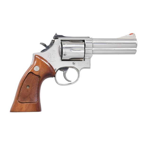 Cal. 357 Mag. S# AAB0830. Bbl. 4" with full underlug. Ramped serrated blade front sight with orange insert. Adjustable square notch rear sight with white outline. Nickel finish with case colored trigger & hammer. Checkered walnut target grips with silver S&W medallions . UNATTACHED ACCESSORIES: mismatched 586 box with manual, paperwork & set of VZ grips.. CONDITION: grips show a few handling marks. Trigger & hammer retain most of their case colors with some operational wear. Balance of metal shows some operational wear & a few light handling marks. Action functions properly when hand cycled. Near excellent bright bore. 25-234/MJC). MODERN. $500-800.