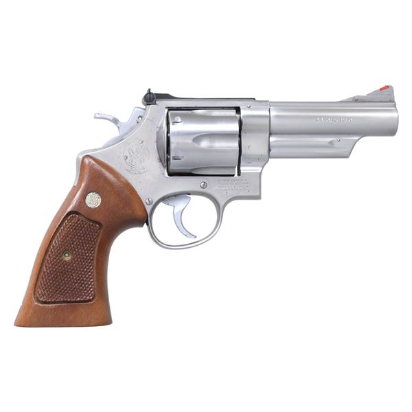 Cal. 44 Mag. S# N871639. Bbl. 4" pinned. Ramped serrated blade front sight with orange insert. Adjustable square notch rear sight with white outline. Early 629 no-dash with pinned bbl. but non-recessed cyl. Stainless finish with hard chrome hammer & trigger. Checkered walnut grips with silver S&W medallions. UNATTACHED ACCESSORIES: walnut presenation case with cleaning rod, brush & screwdriver. CONDITION: grips show a couple dings on bottom & some scattered handling marks. Trigger & hammer remain partially bright with some oxidation spots & operational wear. Balance of metal remains mostly bright with scattered small oxidation spots & some operational wear. Action functions properly when hand cycled. Near excellent bright bore. PROVENANCE: From the Lifelong Collection of George Staden S&W Member #3451. (25-170/MJC). MODERN. $800-1200.