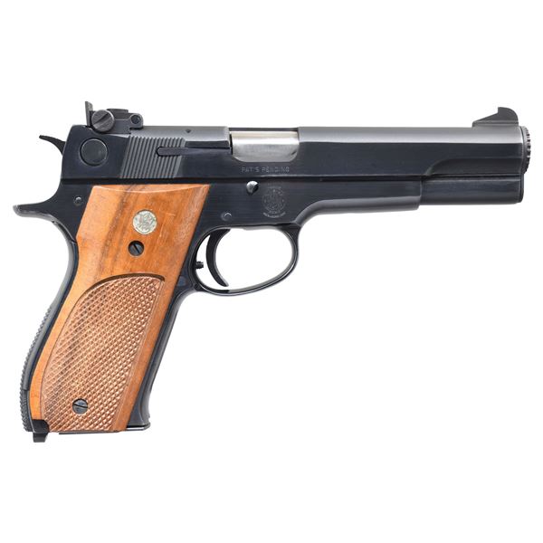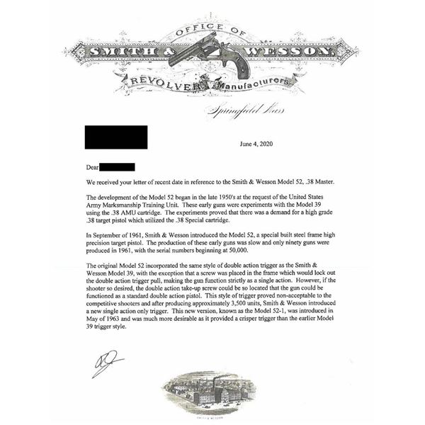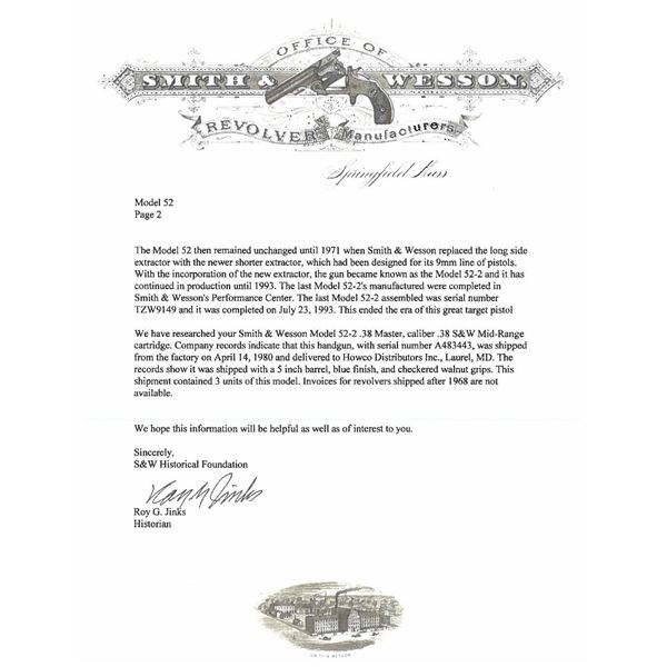 Cal. 38 Mid Range (38 Spl Wadcutter) S# A483443. Bbl. 5". Patridge front sight. Adjustable square notch rear sight. 1980 made 52-2 target pistol. Blued finish Checkered walnut grips with silver S&W medallions. MAGS: 1-5 rd. UNATTACHED ACCESSORIES: factory letter that confirms the gun's configuration & states it was part of a 3 gun shipment to Howco Distributors in 1980. CONDITION: grips show scattered handling marks. Metal retains 99% original blue with some light handling wear. Action functions properly when hand cycled. Near excellent bright bore. PROVENANCE: From the Estate of Jon Thomas, Gunsport, LTD. (25-1110/MJC). MODERN. $900-1400.