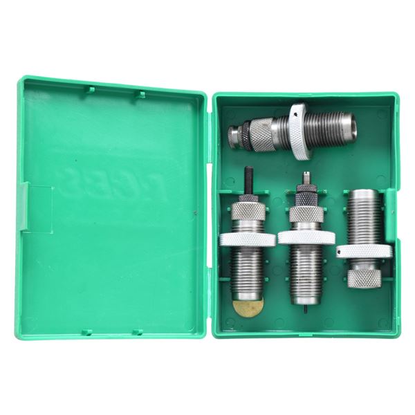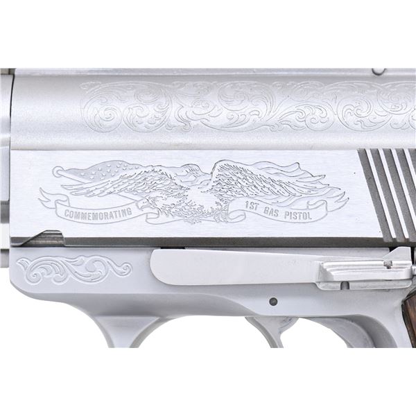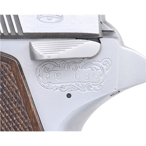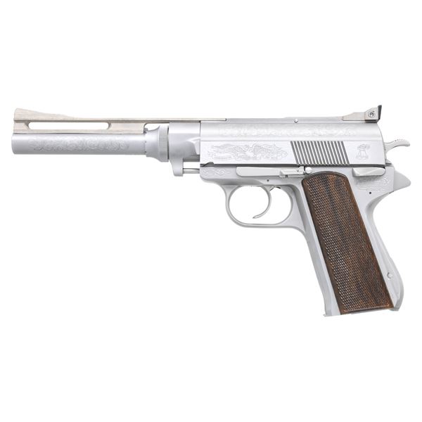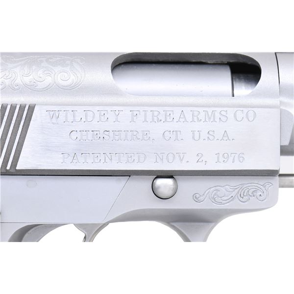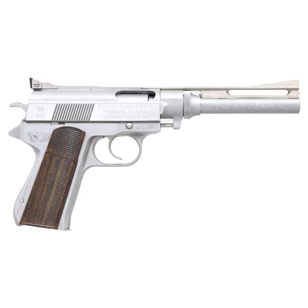 PISTOL. Cal. 45 Win. Mag. S# 45-635. Bbl. 8" VR with integral ramped blade front sight plus slide mounted adjustable rear with matte black sight blade. Double action with 1911 type controls; safety off in up position. Collar at rear of barrel is for regulating gas functioning. Serrated controls along with trigger and grip straps. Mag. latch is European style at base of back strap. Mfg. in Cheshire, CT within the earliest examples as indicated by the 45 serial number prefix. Invented by Wildey J. Moore with "PATENTED NOV. 2, 1976" marked on right side of slide. Very large pistol in bushed and matte stainless steel that was the first gas operated semi-auto pistol having "COMMEMORATIVE" and "1ST GAS PISTOL" in banners on left side of slide below an engraved spread eagle. Pistol has additional decorative engraving being most pronounced on the barrel plus having a Liberty Bell on each side of the slide at the rear. Original company sold after about 800 units with 45 prefix. Next series had 09 prefix; 633 pistols made. Last examples before those today by USA Firearms Corp. have 4 digits only and New Milford, CT address rather than Cheshire, CT. In 1985 the movie "Death Wish 3" had star Charles Bronson portraying Paul Kersey using a 475 Wildey that was actually Bronson's own personal pistol. Besides being the first gas powered pistol of high power, it was also adjustable for mild load functioning as well. As time progressed, other chamberings were offered with the first 3 being 45 and 475 Wildey Mag. plus 45 Win. Mag. References state that the checkering on the grips of presentation models was hand checkered. An iconic pistol of top quality that is seldom offered for sale. MAGS: 3 factory 7 rd. stainless. UNATTACHED ACCESSORIES: original oak presentation case with black velvet lining having cut out fro the pistol, wood ammo block for 5 cartridges plus compartment for two spare mags. with fitted oak cover. Indent for enclosed quality cleaning rod (no tips) and a key for the two case locks. Case has some separation cracks due to aged shrinking of the sectioned oak panels of its construction; near excellent interior. Especially nice original cardboard box with foam lining and end label matching the configuration of the pistol. Very good RCBS 4 die set for reloading. CONDITION: all aspects near excellent including bore and grips. (25-1563/NW). MODERN. $2,500-4,000.