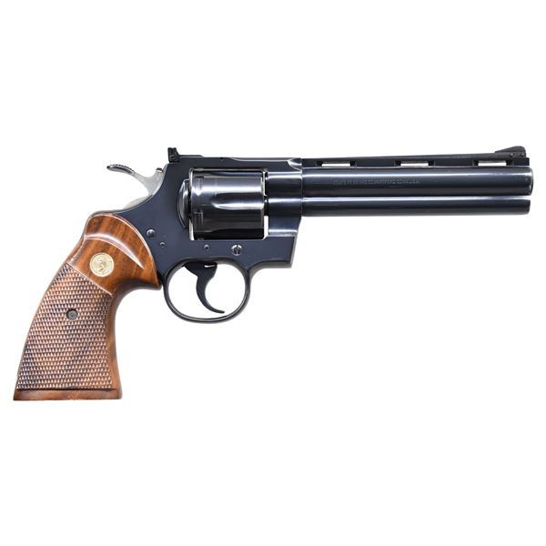 Cal. 357 Mag. S# K16735. Bbl. 6" w/ vent rib & full length ejector shroud. Serrated ramp front sight w/ square notch adj. rear sight. Six shot fluted cyl. Blue finished w/ polished hammer sides. Checkered walnut target grips w/ rampant colt medallions. UNATTACHED ACCESSORIES: foam-lined wood grain box w/ non-matching number. Box contains instruction manual. CONDITION: near excellent, retaining over 98% blue, showing a light cyl. drag line. Near excellent grips. Bright near excellent bore. (25-760/DS). MODERN. $1,500-2,500.