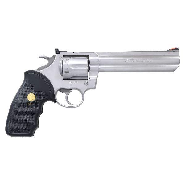 Cal. 357 Mag. S# K8640C. Mfg. 1988. Barrel 6" with full lug. Solid rib has Orange insert ramp front sight. White outline adj. rear sight. 6 Shot fluted cyl. Black neoprene grips with Colt medallions. CONDITION: all aspects very good to near excellent showing light handling marks. Near excellent shiny bore. (25-1467/MD). MODERN. $1,400-1,800.