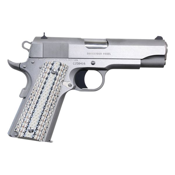 MATCHING FACTORY BOX. Cal. 45 ACP. S# CJ58416. Brushed stainless steel finished with 4.25" barrel. 3 Dot sights. Mil-Tex Marine G10 Grips. MAGS: 1 - 8 rd. CONDITION: blue box with paperwork, lock, hang tag & Ajax #12 white synthetic medallion grips. CONDITION: all aspects near excellent including bore. (25-649/MD). MODERN. $1,500-2,000.