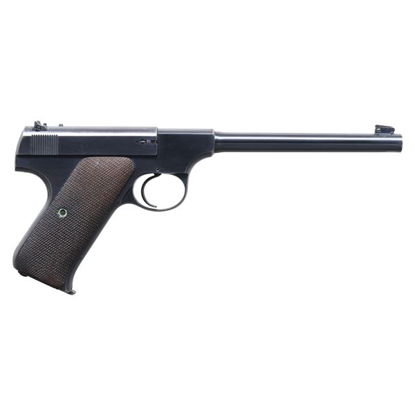 Cal. 22 LR. S# 79201. Bbl. 6 5/8". Adjustable blade front sight w/ windage adjustable square notch rear sight. Blue finish. Two piece checkered walnut grips. Mfg. 1931. MAGS: 1 detachable 10 rd. UNATTACHED ACCESSORIES: Heiser No. 420 leather belt holster in good condition. CONDITION: over 90% original blue, showing slight edge wear. Grips show moderate wear. Very good bright bore. PROVENANCE: the Estate Collection of Charles Wagner. (25-338/DS). CURIO. $1,000-1,500.