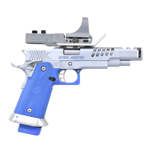PISTOL. Cal. 9x19. S# SAS12380. Bbl. 4.15" w/ T1 compensator. Hard chrome finished modular frame w/ blue checkered polymer grip & integral square trigger guard. Rear of slide has saber tooth cocking serrations. Front of slide has five angular lightening cuts. High grip beavertail safety. Ambidextrous safety. Skeletonized spur hammer & skeletonized trigger. Large flared stainless mag well. STI optics mount w/ blast shield & thumb rest. C-More six minute red dot sight. MAGS: 1 detachable 20 rd staggered w/ blue polymer base. CONDITION: metal finish shows light wear w/ small scratches. Very good bright bore. (24-6351/DS). MODERN. $1,500-2,000.