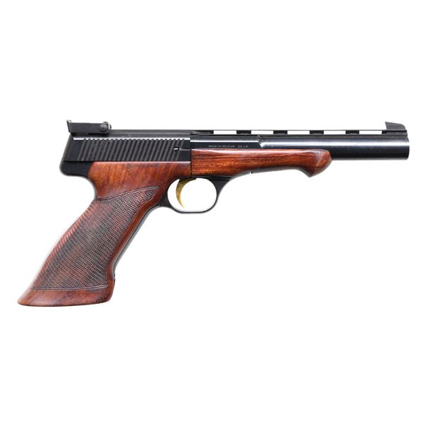 Cal. 22 LR. S# 104293T8. Bbl. 6 3/4" w/ vent rib & target sights. Blue finish w/ gold finished trigger. Checkered thumbrest target grips w/ matching forend. Mfg. 1968. MAGS: 1 detachable 10 rd. UNATTACHED ACCESSORIES: Browning black presentation box w/ red fitted interior. Box contains counterweight set, tool & cartridge block. CONDITION: over 95% blue showing spotted oxidation. Grips have blistering & touched-up finish. Very good bore. (24-6352/DS). CURIO. $800-1,200.