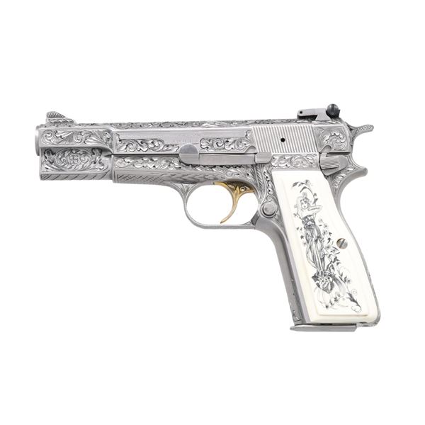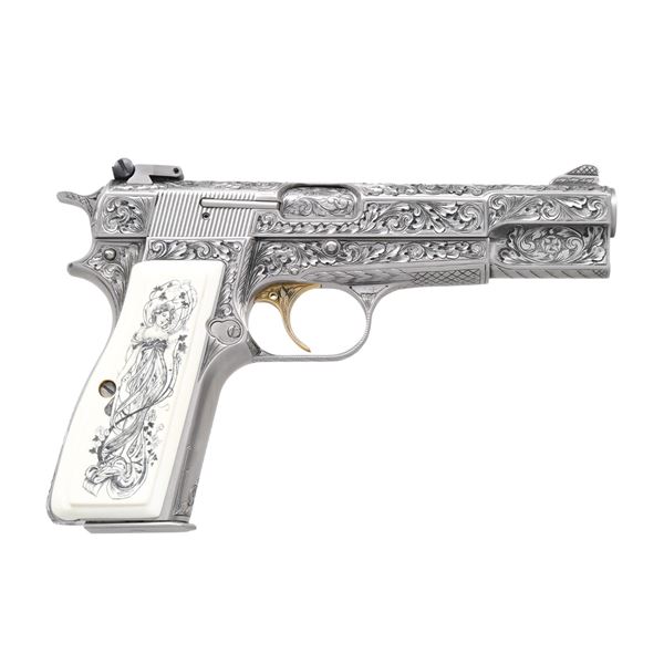 PISTOL SET. Cal. 9m/m P (9mm Luger). S# 76C09352. Bbl. 4 3/4" with matching engraving at port. Mfg. 1976 with factory adjustable sights; serrated ramped blade on corresponding ramped base plus dovetailed rear having sighting portion with matte blued finish. Stunning example showcasing the work of America's master engraver, Ben Shostle of Muncie, IN who founded the Firearms Engraving Guild of America and was its past president. Shostle style deep relief carving with scrolls. The finish is satin nickel that appears stainless. There are two engraving signatures; at the rear edge of the magazine well and on the outer curve of the dust cover (left side) just forward of the trigger guard. Bottom of dust cover has German waffle style engraving with punch dots. Extensive coverage to include its front sight and gold plated trigger. Grip straps have lesser degree of engraving being mostly at the base of each. Standard Belgian markings on front corners of trigger guard and left side of slide. Scrimshawed ivory grips of Browning pattern with raised panels having Victorian style images of ladies in evening gowns; each is distinctly different with Shostle's daughter's signature of "bb" (Benita Bonshire) on each panel. Internet research has shown his scrimshawed signatures as "bbs"; these grips clearly do no have the "s". Wonderful work of art on a firearm with world wide appeal. MAGS: 1 factory 13 round with push button base, black plastic follower, matte nickel finish and minimal function wear; does not drop free having minimal resistance. UNATTACHED ACCESSORIES: exceptional (near excellent with occasional light exterior handling marks) fitted case of English style with dark maroon velvet outlines for the pistol and its accessories; padded velvet under lid that is hinged with barrel style hidden hinges. Centered, single brass key lock latch (no key). Ivory manufactured (or decorated) tools having gold plated metal parts. All ivory oil bottle with threaded stopper / applicator. Cleaning rod with end drilled and tapped for cleaning items; ivory handle. Ivory handled dust brush resembling a shaving cream bush. Two ivory handled "turn screws" with identical appearance except for blades of each being 90 degrees apart from each other in reference to handle orientation. Shostle sales brochure and special props for holding the lid on display. CONDITION: trigger has thinning finish on its face and is missing the magazine safety mechanism that would normally allow magazines to drop free; they release with minimal resistance. Small section of missing ivory on butt of left grip where there is a change from magazine well width to backstrap width; it appears that extra material was removed in error when made and a bit of amber colored material (epoxy?) was added but not sufficient to fill the void (only visible with direct view of butt). All other aspects of the pistol are near excellent with new, unfired appearance. (25-222/NW). MODERN. $5,000-8,000.