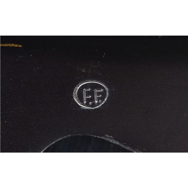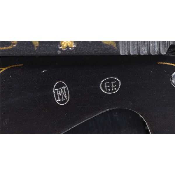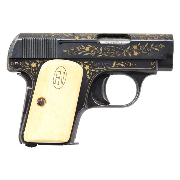 PISTOL, TYPE VI ENGRAVED, WITH FACTORY BOX. Cal. 25. S# 987871. Bbl. 2 1/8". Model 1905 semi-automatic pistol mfg. by Fabrique Nationale. The left side of the slide is marked "FABRIQUE NATIONALE D ARMES de GUERRE HERSTAL BELGIQUE/ BROWNING'S PATENT DEPOSE". Left side of the frame, slide, and right side of the bbl. exhibit Belgian commercial proofs. Left side of the frame is engraved with a small "FN" within an oval, followed by an encircled "F.F." ("F.F." also engraved on right side) beneath the grip panel. Frame, slide, and grip safety exhibit foliate gold inlays in the factory Type VI pattern. Frame appears to retain its original blue finish, with the slide having been reblued at one time. Frame is mounted with 2-piece ivory grips, which are embellished, with "FN" within an oval at the top of the panels. Grips no longer retain their escutcheons at the screw slots, with the left panel exhibiting a contemporary screw nut. Slide features a grooved sight channel, with a fixed blade front sight and U-notch rear sight. All serialized parts are matching and include the frame, slide, and bbl. MAGS: 1 6-rd. UNATTACHED ACCESSORIES: original factory box, ink stamped "FN" within an oval above an encircled ".25", and an impressed "BROWNING" on the lid. CONDITION: frame retains the majority of its original factory blue finish, exhibiting some areas of wear and thinning that show through to gray patina, as well as some scattered spots of light to mild surface oxidation. Slide is very good, as refinished, exhibiting light surface level pitting overall, with a few scattered spots of mild pitting. Mirror bore, exhibiting well defined rifling throughout. Grips are very good, retaining a pleasing mellow patina, while showing some light superficial marks from handling and storage. Box exhibits some light to mild wear, scattered spots of staining, and age related discoloration overall. 2 corners of the lid show some tearing, but box otherwise remains sturdy and serviceable. (25-1198/MLW). CURIO. $1,000-1,500.