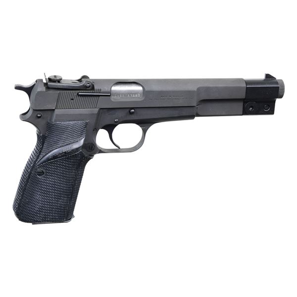 SEMI-AUTOMATIC PISTOL WITH MATCHING FACTORY HARD CASE. Cal. 9mm Luger. S# 245PY57223. Bbl. 6". High Power GP Competition semi-automatic pistol mfg. in Belgium by Fabrique Nationale and imported by Browning Arms Company in 1982. The left side of the slide is marked "BROWNING ARMS COMPANY MORGAN, UTAH & MONTREAL P.Q.", with "MADE IN BELGIUM/ BY FABRIQUE NATIONALE HERSTAL" marked on the right. Frame, slide, and muzzle nut exhibit a phosphate finish, with small parts including the trigger, slide catch lever, slide safety lever, hammer, and rear sight assembly exhibiting a blue finish. Bbl. is polished in-the-white, with the counterweight exhibiting a black enamel type finish. Frame is mounted with a 1-piece Pachmayr Signature Model checkered black rubber wrap around grip. High profile fixed blade front sight (integral to counterweight), with fully adj. square notch rear sight. All serialized parts are matching via the full S# and include the frame and bbl. MAGS: 2 13-rd. mags., with phosphate finished bodies and blued button floorplates. UNATTACHED ACCESSORIES: matching factory hard case, containing factory paperwork, a cleaning rod, and 2 disassembly tools. CONDITION: exceptional, with metal components retaining bountiful amounts of their original factory finishes overall. Brilliant mirror bore, exhibiting sharp and well defined rifling throughout. Grip is excellent overall. An exceptionally fine example of a Belgian Browning High Power GP Competition, with its matching factory hard case, that one would fine to be difficult to upgrade from. PROVENANCE: the Estate Collection of Charles Wagner. (25-254/MLW). MODERN. $1,000-1,500.