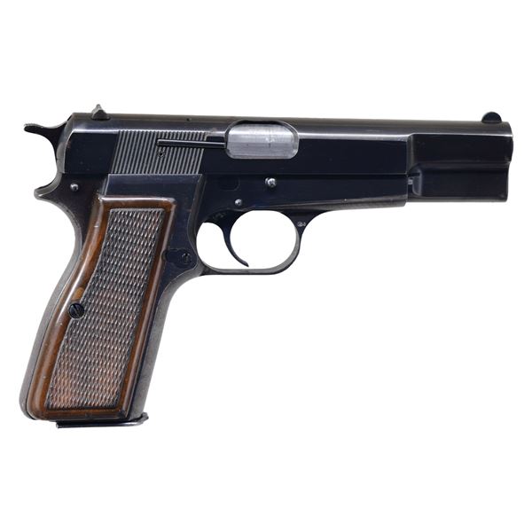 Cal. 9mm Luger. S# 72C62834. Bbl. 4 5/8". Round blade front sight. Square notch rear sight. 1972 made Browning Hi-Power pistol. Blued finish. Checkered brown plastic grips. MAGS: 2-13 rd. UNATTACHED ACCESSORIES: aftermarket hardcase. CONDITION: grips show scattered flaking & some dings. Metal retains 60% original blue with scattered oxidation most notably on both grip straps & some edge wear. Action functions properly when hand cycled. Bright near excellent bore. PROVENANCE: From the Lifelong Collection of George Staden S&W Member #3451. (25-15/MJC). CURIO. $700-1000.