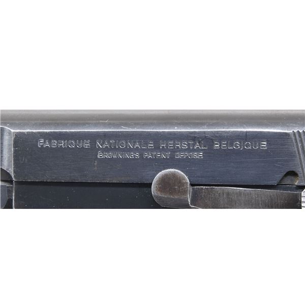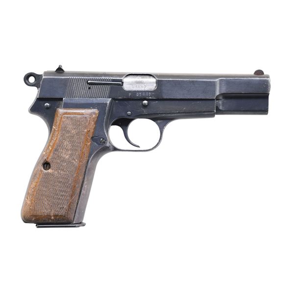 PISTOL. Cal. 9mm Luger. S# F01807. Bbl. 4 5/8". Hungarian copy of a Fabrique Nationale High Power semi-automatic pistol. While at first glance, appearing to be an FN produced High Power there are several minute differences, that while small (S# and slide catch lever slot), indicate that this example was instead mfg. in Hungary, likely by FEG. The left side of the slide exhibits a spurious FN roll stamp "FABRIQUE NATIONALE HERSTAL BELGIQUE/ BROWNING'S PATENT DEPOSE", with a spurious Belgian commercial proof marked on the right side of the trigger guard and on the right side of the bbl. Underside of trigger guard exhibits a Century Arms import mark. Metal components exhibit a blue finish overall, save for on the 2-piece bbl., which is polished in-the-white. Frame is mounted with 2-piece checkered wood grips. Fixed fat half-moon blade front sight, with dovetailed square notch rear sight. All serialized parts are matching and include the frame (front grip strap), slide, and bbl. MAGS: 1 blued 13-rd., with a WaA140 proof on the spine, and with a blued split tail floorplate. CONDITION: metal components retain the majority of their original blue finish, exhibiting areas of wear and thinning that show through to gray and brown patinas, scattered superficial handling marks, as well as scattered areas of light to mild surface oxidation overall. Very bright bore, exhibiting some light pitting and some spots of grease, while retaining well defined rifling throughout. Grips show smoothing, scattered marks and minor impressions from handling and storage, as well as areas of flaking and wear to their varnish, but otherwise remain sturdy and serviceable. PROVENANCE: the Estate Collection of Charles Wagner. (25-274/MLW). MODERN. $800-1,200.