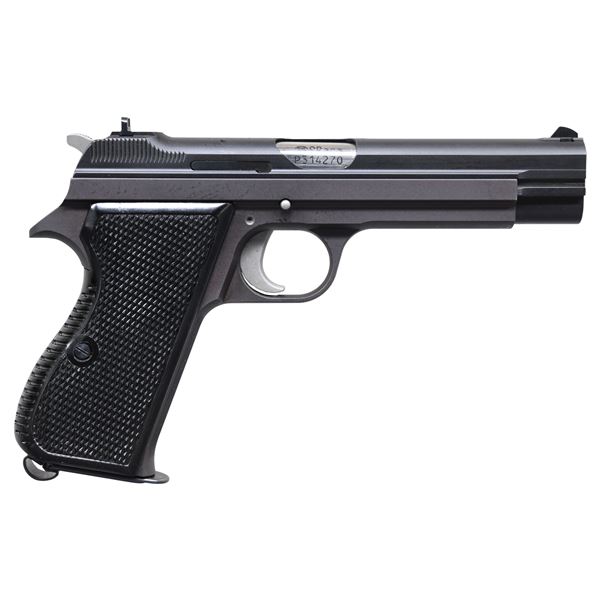 Cal. 9mm Para. S# P314270. Bbl. 4 3/4". Blade front sight. U-notch rear sight. Matching numbers on frame, slide & bbl. Swiss made P210-6 pistol. Left side of slide has Sig Arms Exeter, NH import marking. Phosphate finish. Checkered black grips. MAGS: 1-8 rd. UNATTACHED ACCESSORIES: matching numbered factory box with interior that is crumbling. CONDITION: all aspects near excellent. Metal & grips show minor handling & operational wear. Action functions properly when hand cycled. Bright near excellent bore. PROVENANCE: From the Lifelong Collection of George Staden S&W Member #3451. MODERN. (25-193/MJC). MODERN. $3000-5000.