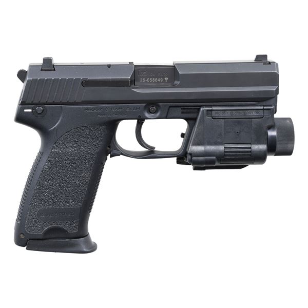 Cal. 45 ACP. S# 25-058649. Bbl. 4 1/3". Three dot sights. 1999 made Variant 1 pistol with left side safety that also acts as a decocker. Matte black finish. Polymer frame with accessory rail & HK MKII Tactical Light. MAGS: 2-12 rd. UNATTACHED ACCESSORIES: aftermarket softcase. CONDITION: frame shows some light handling marks. Slide shows scattered edge wear. Action functions properly when hand cycled. Bright near excellent bore. (25-1012/MJC). MODERN. $800-1200.