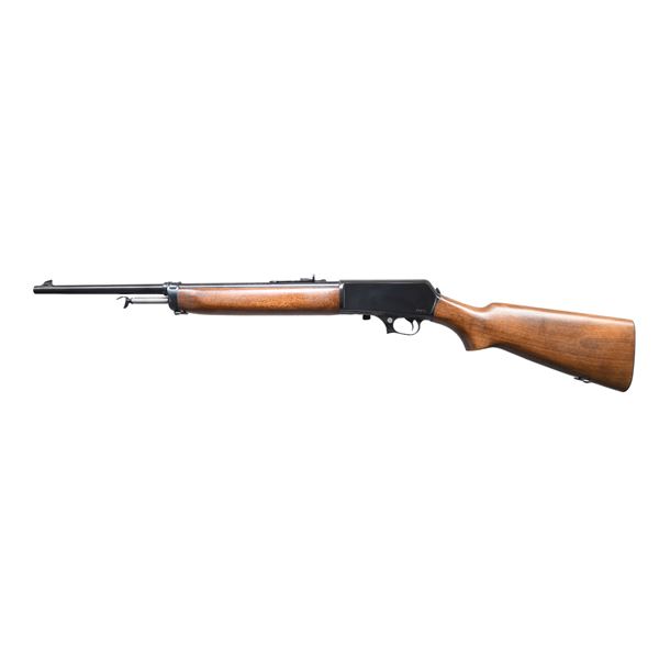 Cal. 351 Win Self-Loading. S# 55676. Bbl is 20" round with sporting sights. Action rod has finger curled actuation button. Blue finish. Semi-beavertail forearm and pistol grip walnut stock with checkered steel buttplate and sling swivels. Manufactured 1907-57. Magazine, 1 detachable 10 rd . UNATTACHED ACCESSORIES: proper style Winchester box without a label. Box contains instructions, safety brochure, hang tag, and older sales receipt. Box has one torn end flap. CONDITION: near new, appears unfired. Retaining 99% original finish. Bright, near excellent bore. (25-1470/DS). CURIO. $2,000-3,000.